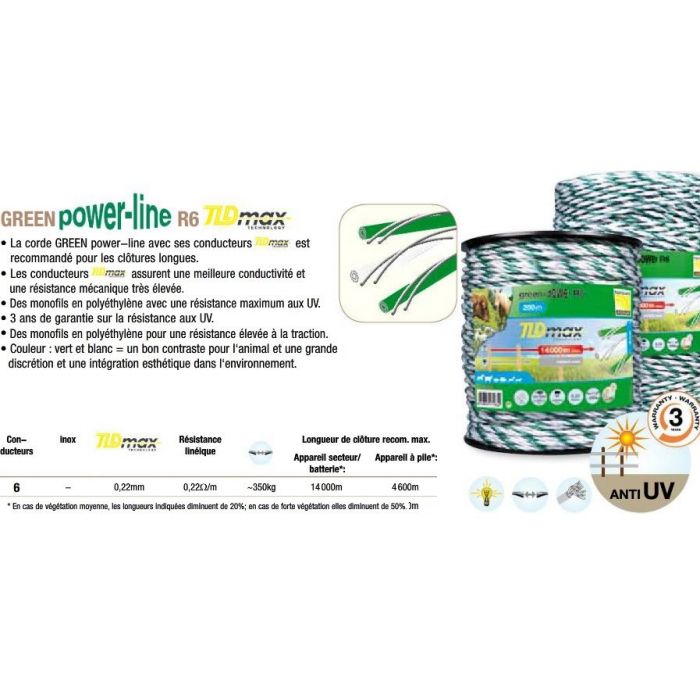 Cordelette GREEN-POWER R6 couleur verte diamètre 6mm, pour clôture électriques Longues.