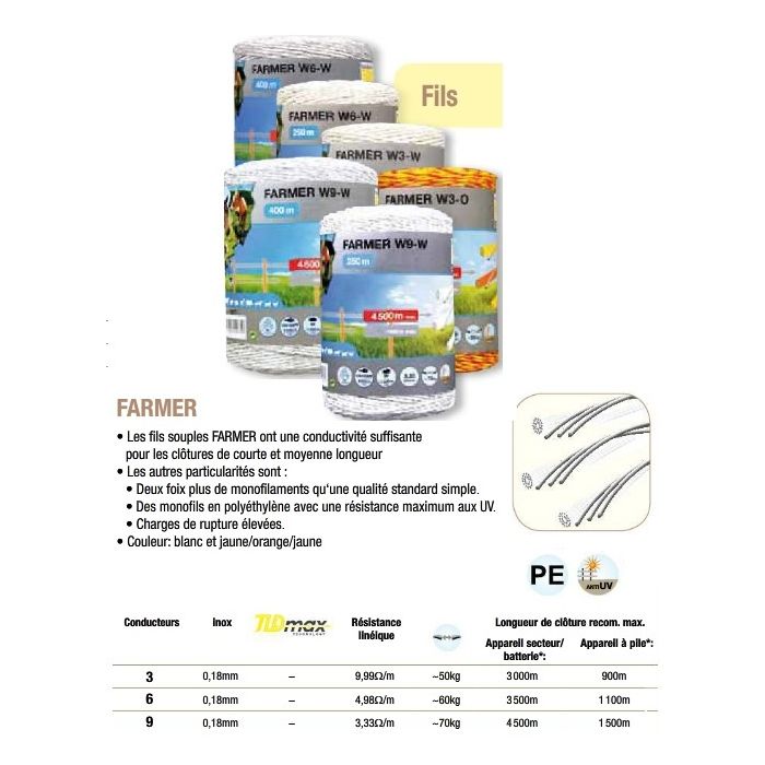 Fils Farmer W Blanc et jaune/orange, pour clôture électriques courte et moyenne longueur.