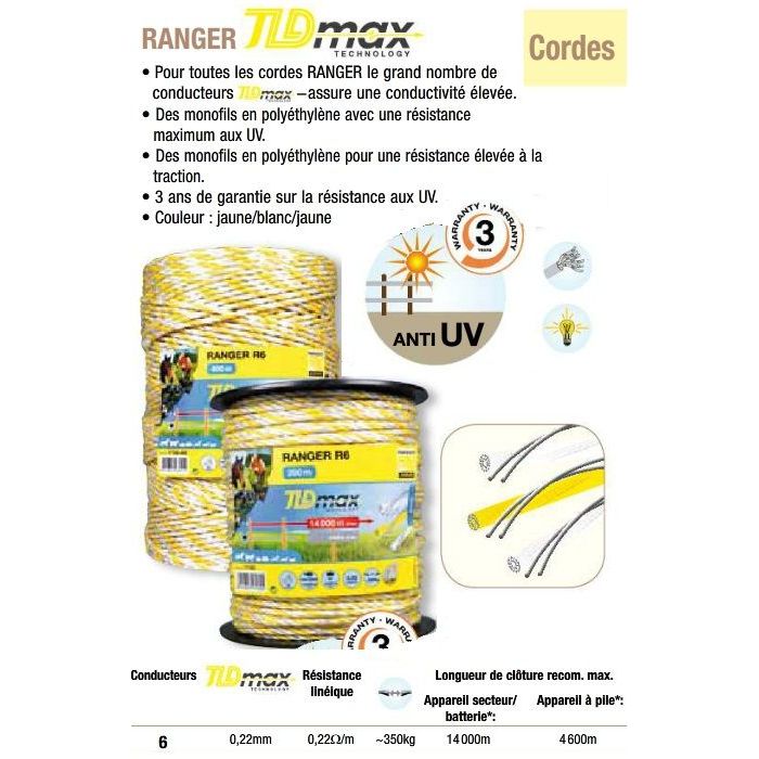 Cordelette Ranger R6 couleur Jaune & Blanc diamètre 6mm, Haute qualité pour toutes clôture électriques.