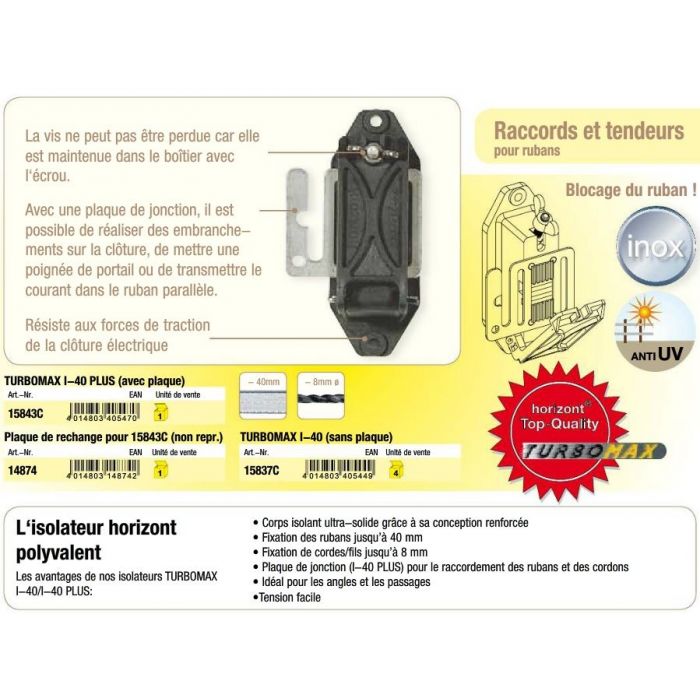 Isolateur TURBOMAX I-40 Plus, pour rubans, fils et cordelettes, avec plaque de jonction