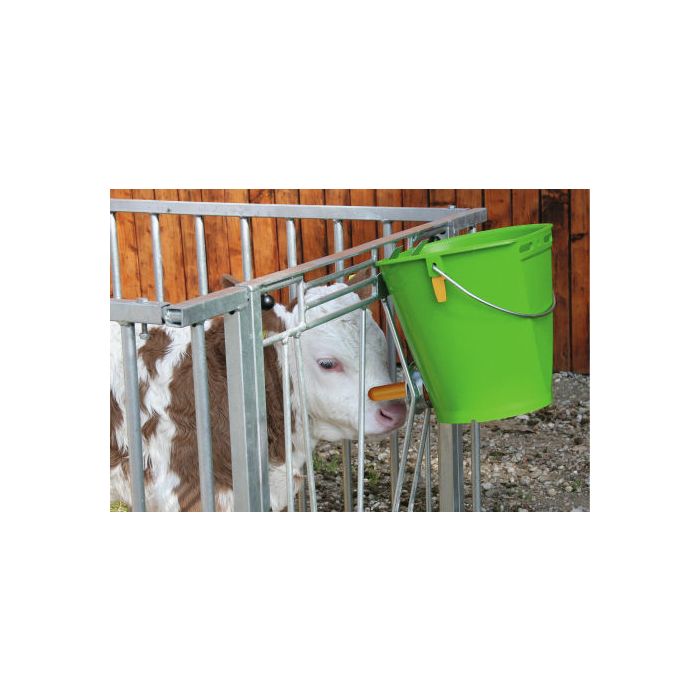 La soupape hygiénique avec mécanisme rabattable permet de réduire le nombre de germes dans l'environnement et d'assurer une croissance saine des veaux. La soupape hygiénique remplace les clapets anti-retour à bille. Le raccord amovible simplifie et facilite le nettoyage, facilement réalisable avec une brosse ronde. La tétine se démonte en un clin d'œil grâce à une fermeture à baïonnette. Le support de séchage est fixé latéralement sur les supports des anses et permet l'égouttage et le séchage de la soupape et de la tétine. Abreuvoir avec étrier mécanique. L'abreuvoir résiste aux acides, peut être mis en contact avec les aliments. Il est sans cadmium. Facile d'entretien. Vous pouvez le fixer grâce au dispositif d'accrochage zingué vendu séparément sous la référence KER1410. Vendu par lot de 5 seaux.