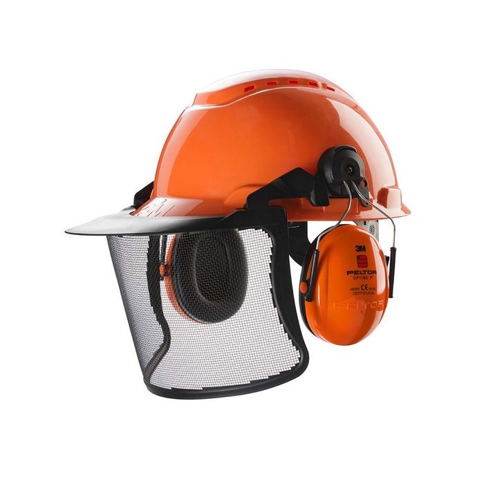 Casque en matière HDPE particulièrement légé, en plastique robuste, résistant au froid. Excellente ventilation grâce à de grands orifices d'aération. Livrée avec équipement intérieur., stabilisée aux UV, avec grille protectrice et capsules de protection auditive. Le kit pour la protection optimale de la tête, du visage et de l'ouïe lors de travaux avec tronçonneuse, marteau perforateur et autres.