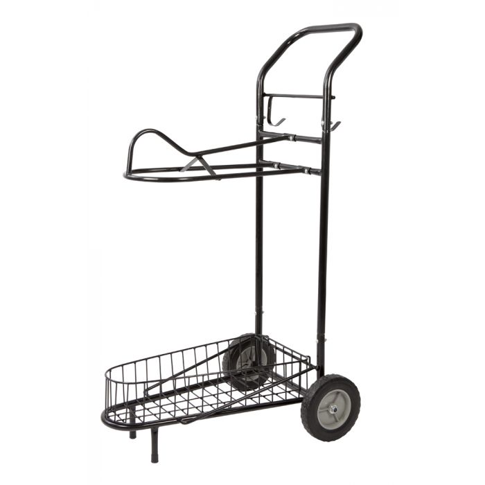 Chariot en tube en acier de qualité supérieure avec un porte-selle, deux porte-filets et un compartiment spacieux pour les ustensiles de nettoyage, de pansage et de soins.