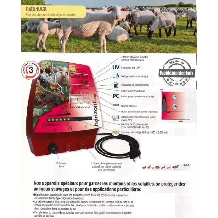 • Appareil à batterie très puissant pour des clôtures longues sans végétation intensitée maxi 1,6 joules, puissance 9000 volts et longueur de cloture 30 KM norme CEE.Pour une utilisation maximal de l'électrificateur hotSHOCK A15 mettre 1 piquet de terre longueur de 1,5 m.