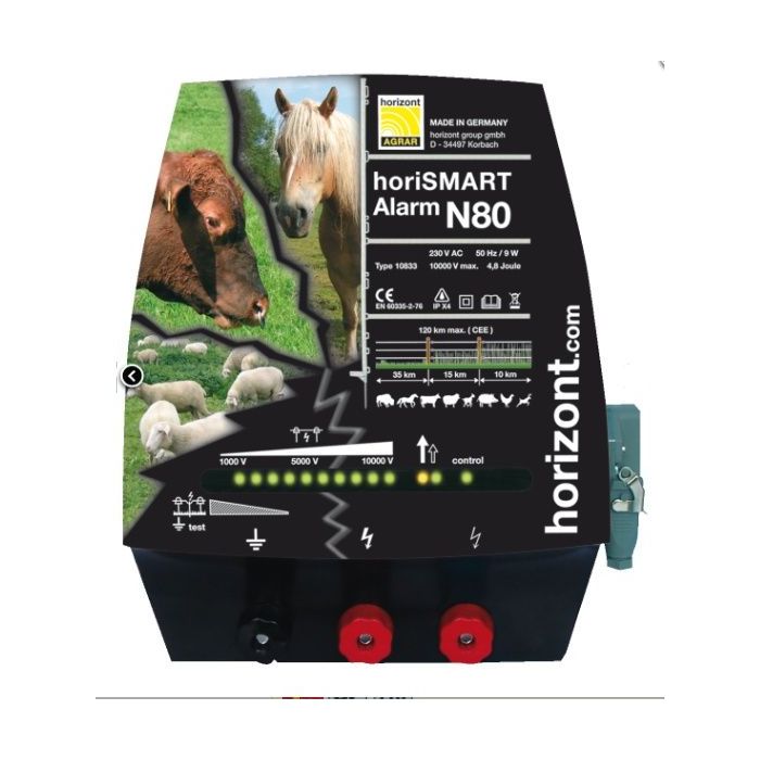 Electrificateur secteur 230 volts 6,8 joules modèle horiSMART N80 Alarm équipée de 2 sorties tension et d'une prise d'alarme en plus. Une sortie de puissance forte et une sortie de puissance faible.• Effet turbo pour une puissance supplémentaire (p. ex. en cas de court-circuit sur la clôture) Sur demande, les alarmes horiSMART peuvent être configurées de telle sorte qu'un fontionnement avec boucle de clôture soit possible. Dans ce cas la tension de l'extrémité de boucle de clôture est affichée par l'appareil. Prenez contact avec nous !
