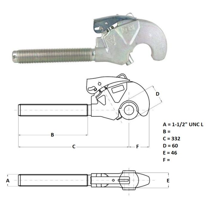 Crochet de barre de poussée CBM filetage de la tige 1"1/2, longueur 332 mm filet gauche.