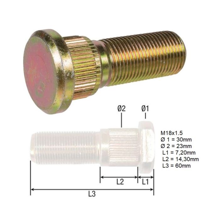 Goujon de roue M18x1.5 x L61 mm pont avant ZF APL-1251, APL-1351, APL-1552