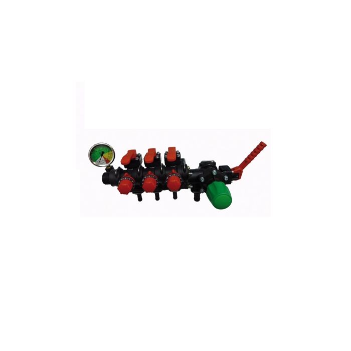 Vanne général manuel entrée diamètre 19 mm + vanne régulatrice mécanique avec retour cuve diamètre 25 mm , 1 retour compensé diamètre 25 mm + 3 vannes de section avec raccord diamètre 13 mm + filtre 160 l /min.