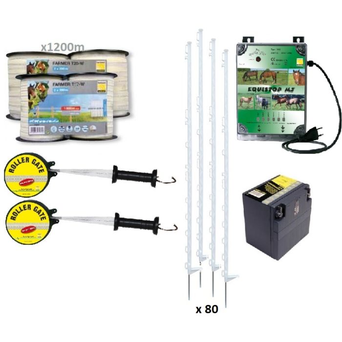 Kit clôture électrique 1 hectare pour chevaux. Electrificateur secteur 230V, Ruban, Piquet, Portillon.