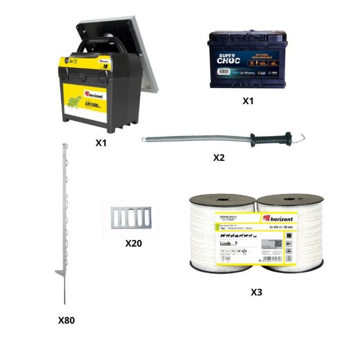 Kit clôture électrique 1 hectare Horizont cheval, poney avec 3 rangées de ruban, piquet hauteur 1.20m, 2 portillons, 1 électrificateur solaire