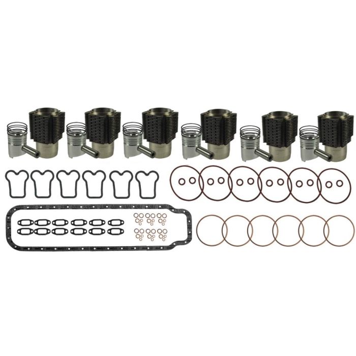 Détail du jeu de révision moteur : 6 Cylindres, 6 Pistons, 1 Joint de carter, 6 pochettes joint de rodage, 6 Jeu de segments.