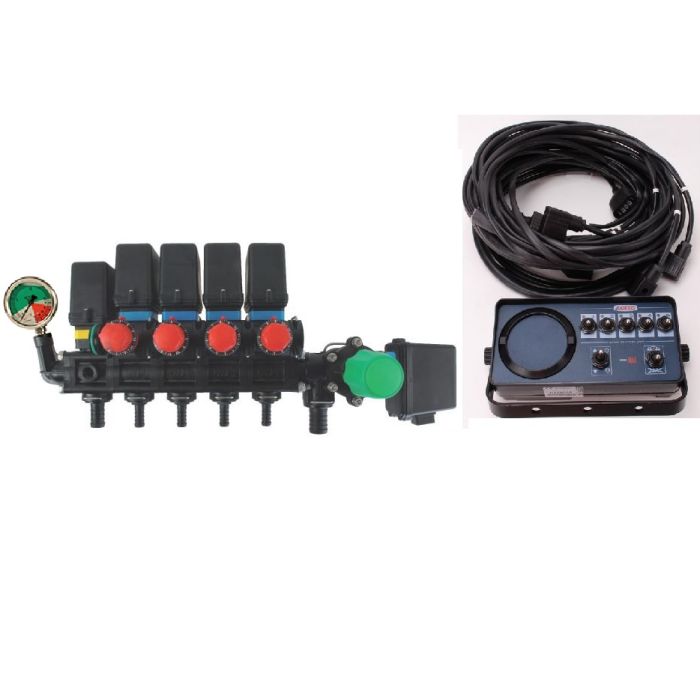 Le kit contient : 4 vannes de sections avec retour compensé, Vanne générale + vanne régulatrice mécanique + vanne régulatrice électrique (100 l / min) + boitier de commande (avec faisceau 4 m) + manomètre sur le groupe.