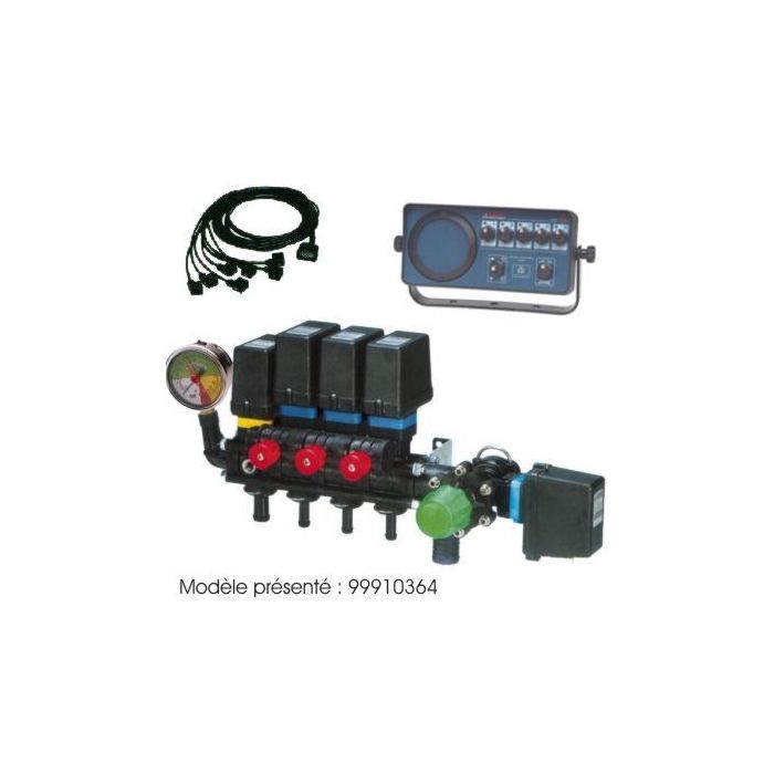Vanne générale + vanne régulatrice mécanique + vanne de section + vanne régulatrice électrique (100 l / min) + boitier de commande (avec faisceau) avec retour compensé + manomètre sur le boîtier.