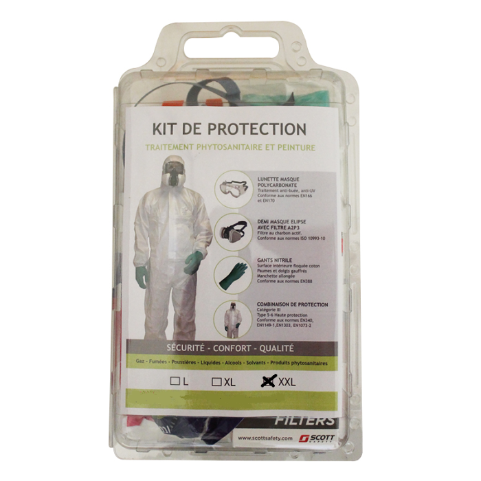 Le kit contient : un demi-masque, un kit de 2 filtres A2P3, une paire de lunette-masque 4800F, une combinaison Topsafe (taille XXL), une paire de gants Optinit (taille 10).