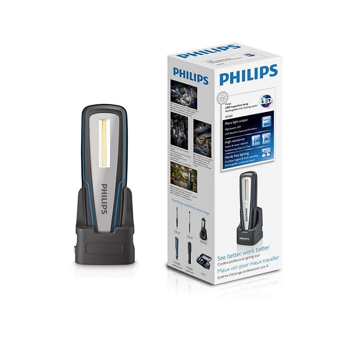 Lampe rechargeable avec station d'accueil, outil d'éclairage professionnel sans fil; Ses strip LED produisent un faisceau lumineux puissant et régulier illuminant tous les recoins