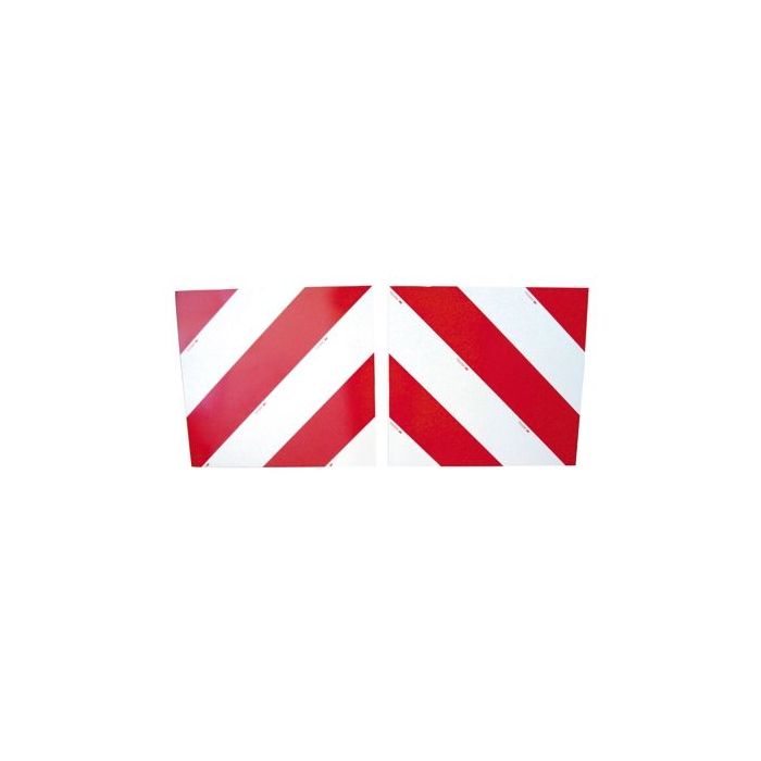 Lot de 2 panneaux PVC à bandes rouges et blanches droit et gauche. Dimensions : 423 x 432 x 4 mm d'épaisseur. Revêtement RFT. Perçages à prévoir. Homologué classe 1 => uniquement pour les routes secondaires et doit être éclairé la nuit. Vendu par 5 unités.