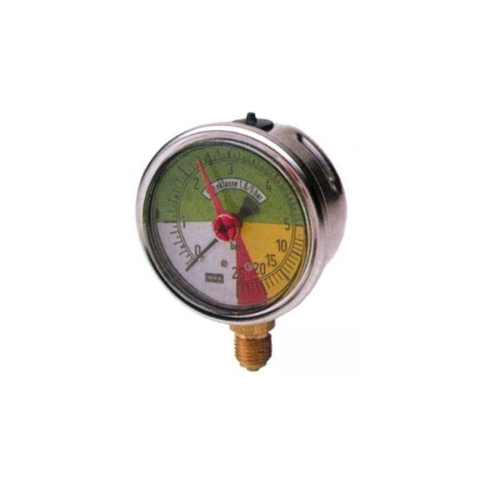 Ce manomètre est gradué tous les 0.2 bars de 0 à 15 bars et tous les 12bars de15 à 60 bars ces deux échelles sont marquées par un code de couleurs.