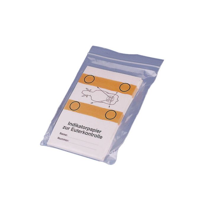Papier réactif de la mammite qui se présente avec une zone de test. Un simple jet de lait sur la zone témoin donne une réaction de couleur : vert foncé ou bleu vert pour les mamelles infectées, vert ou jaune pour les mamelles saines. 1 paquet contient 25 papiers indicateur. Vendu par lot de 10 paquets.