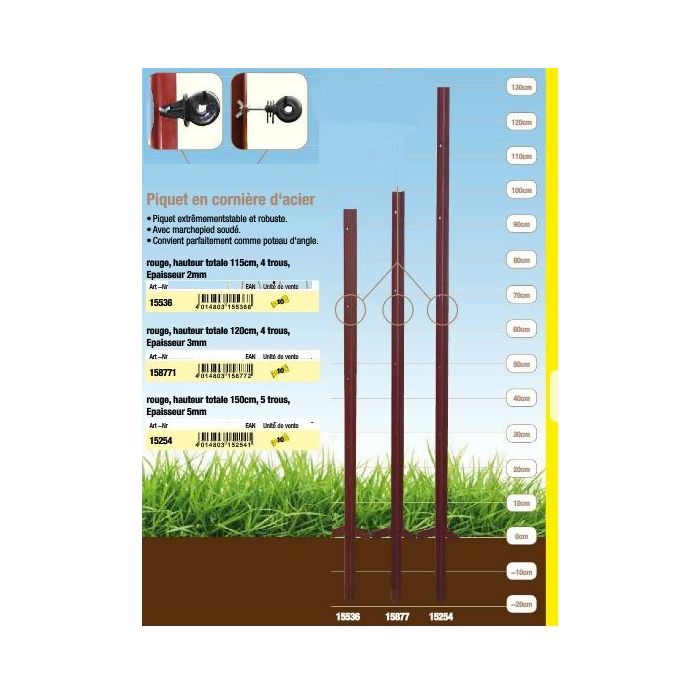 Piquet d'angle en cornière d'acier avec marche pied soudé couleur rouge. Paquet de 10 pièces.