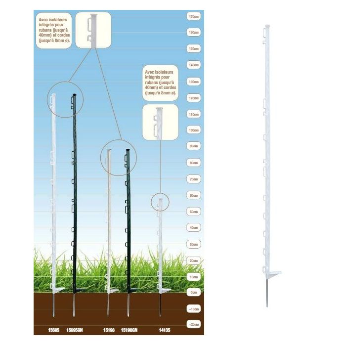 Piquet plastique standard hauteur 75cm avec 7 passe-fils,couleur blanc ou vert, paquet de 10 pièces.
