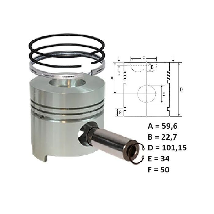 Piston 3 segments, Ø 103 mm hauteur 101,15mm - Ø axe de piston 34 x 89,8 mm - Chambre de combustion Ø 50 x Profondeur 22,7 mm