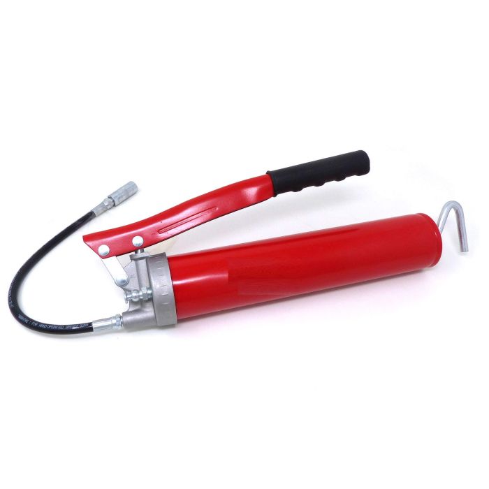 Pompe à graisse avec tuyau souple renforcé 300mm et agrafe 4 mors, pour cartouches 400 g ou graisse en vrac