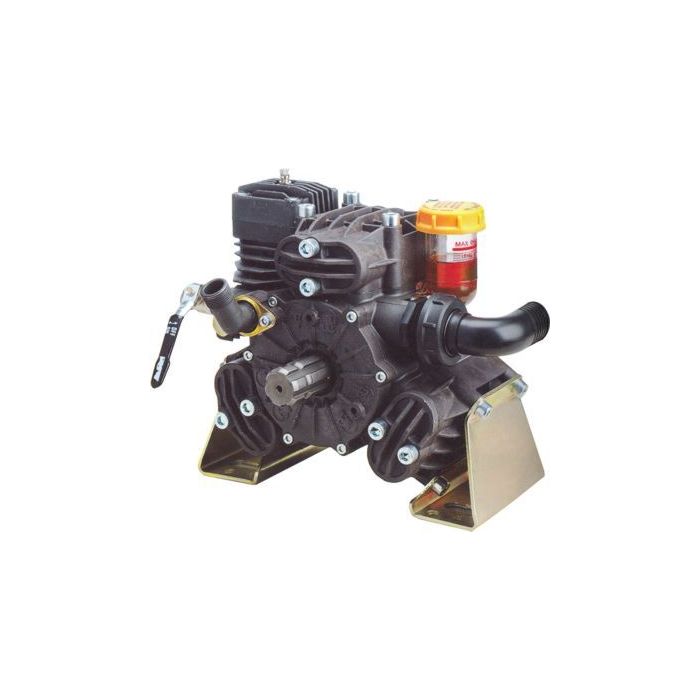 Pompe en alliage léger de design compact livrée avec support. Mécanisme à l'intérieur lubrifié en bain d'huile, chemise en fonte auto-lubrifiée avec deux segments par piston pour assurer un rendement volumétrique optimal. Parties en contact du liquide anodisées, clapets d'aspiration et refoulement en acier inox.
