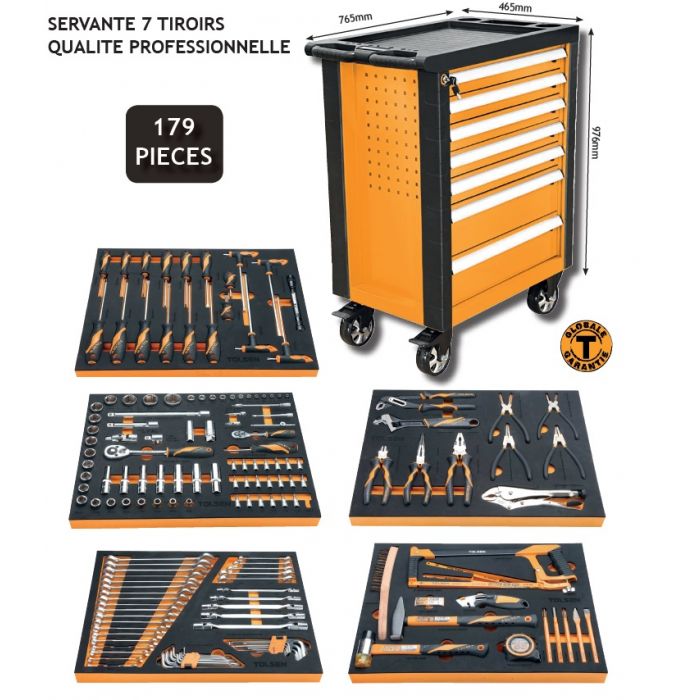 Servante avec 179 outils 7 tiroirs avec mousse de maintien des clés. composition TOLSEN