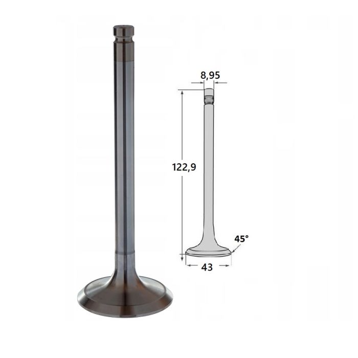 Soupape d'admissiontige 8,95 - hauteur 123 - tête 41 mm - angle 45° moteur Perkins 1004-40T AK, AL, 1004-40TW AM, AP, AQ, JCB, 1106C-E60TA VK, 1006-60 YG, 1006-60T YH, 1006-60TW YK, Landini, Hitachi, McCormick, Manitou, Fuchs, Terex, Claas, Weidemann, Zeppelin ...