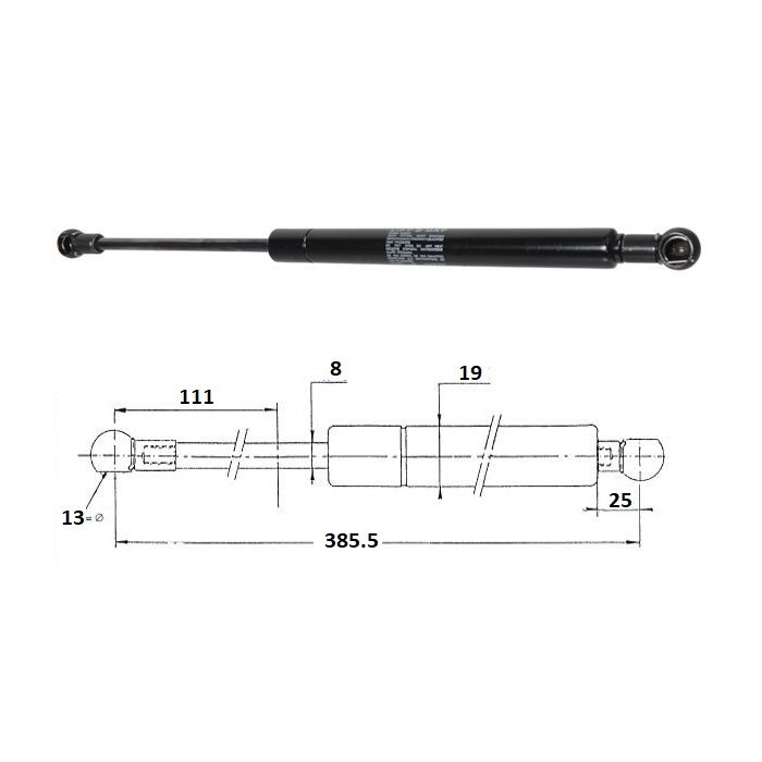 Vérin à gaz de porte longueur 385 pour rotule diamètre 13 force 400 NM